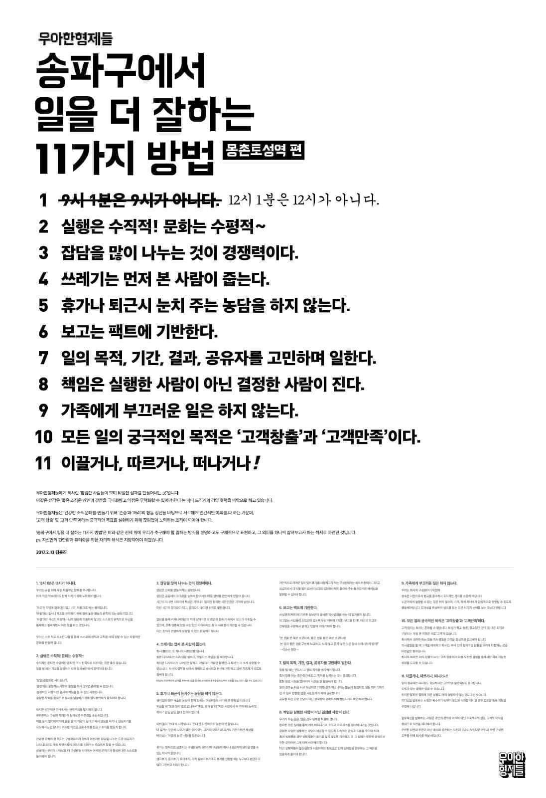 변하지 않는 것과 변하는 것이 존재한다. 그중 변하는 것이 압도적으로 많다. 현실은 끊임없이 변한다. 중요도로 보면 또 다르겠지만.. 회사에 붙어있는 송파구에서 일 잘 하는 11가지 방법 정도가 변하지 않는 것이고, 나머지는 대부분 변한다. 무언가를 계속 동일하게 추구하면 집착이 생긴다. 그런 것들을 경계해야 한다.