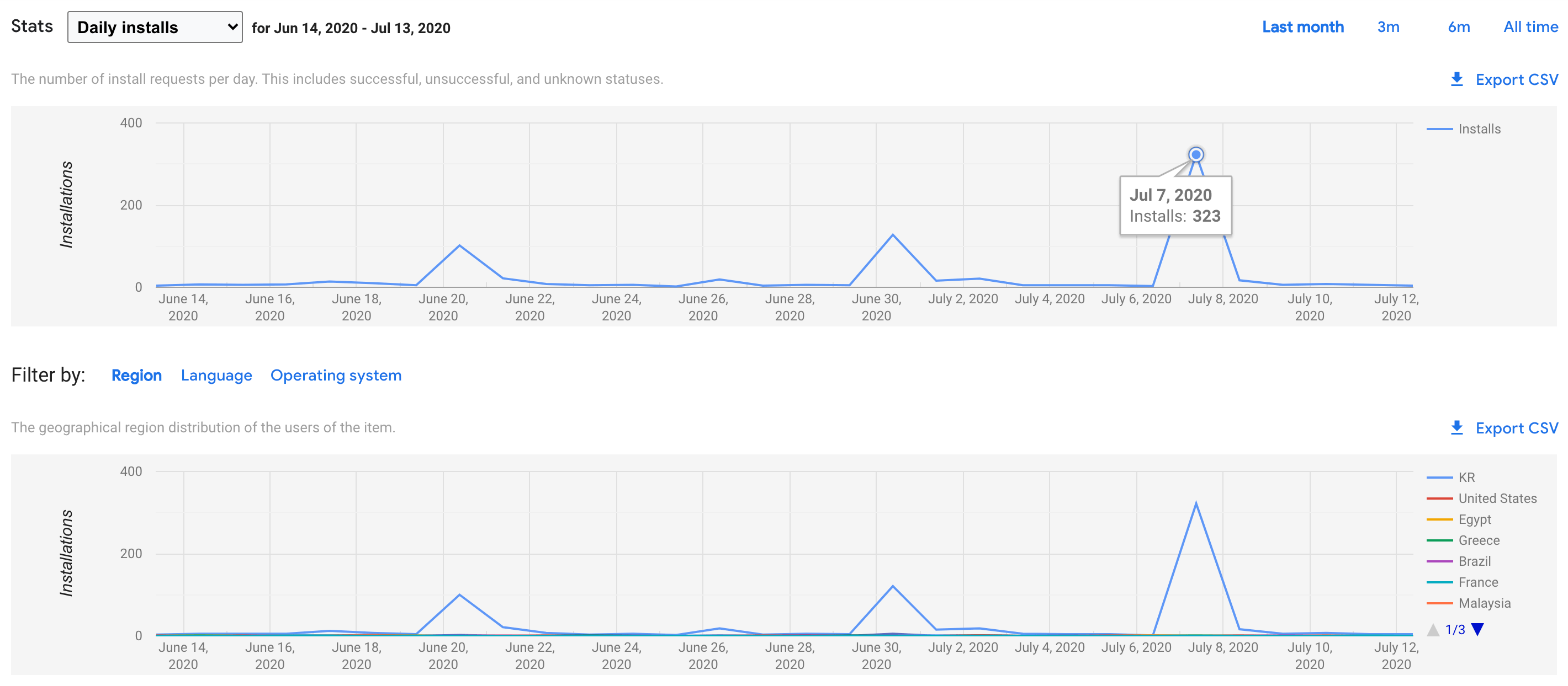 5월 말 경에 스토어 링크 복사 버튼을 추가했다. 유튜브 데스크톱에서 관련 확장 프로그램까지 설치해서 쓸 사람이라면 이미 비슷한 사람들이 모이는 커뮤니티에서 활동을 하고 있을 것 같았고 홍보를 간편하게 도와주는 것만으로 자발적인 홍보 효과가 날 것이라고 생각했기 때문이다. 이후 신규 사용자가 급증하는 날이 몇 차례 있었다. 커뮤니티에 관련 게시물 또는 댓글이 올라간 것이었다.