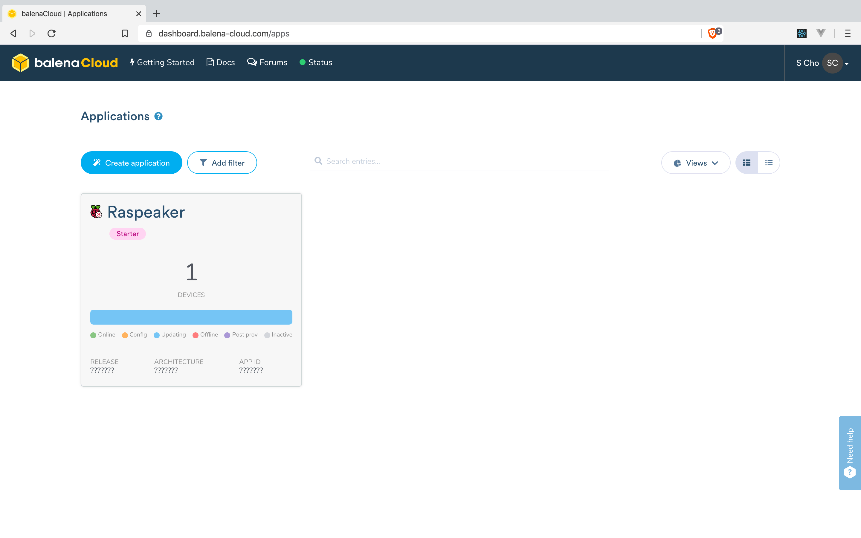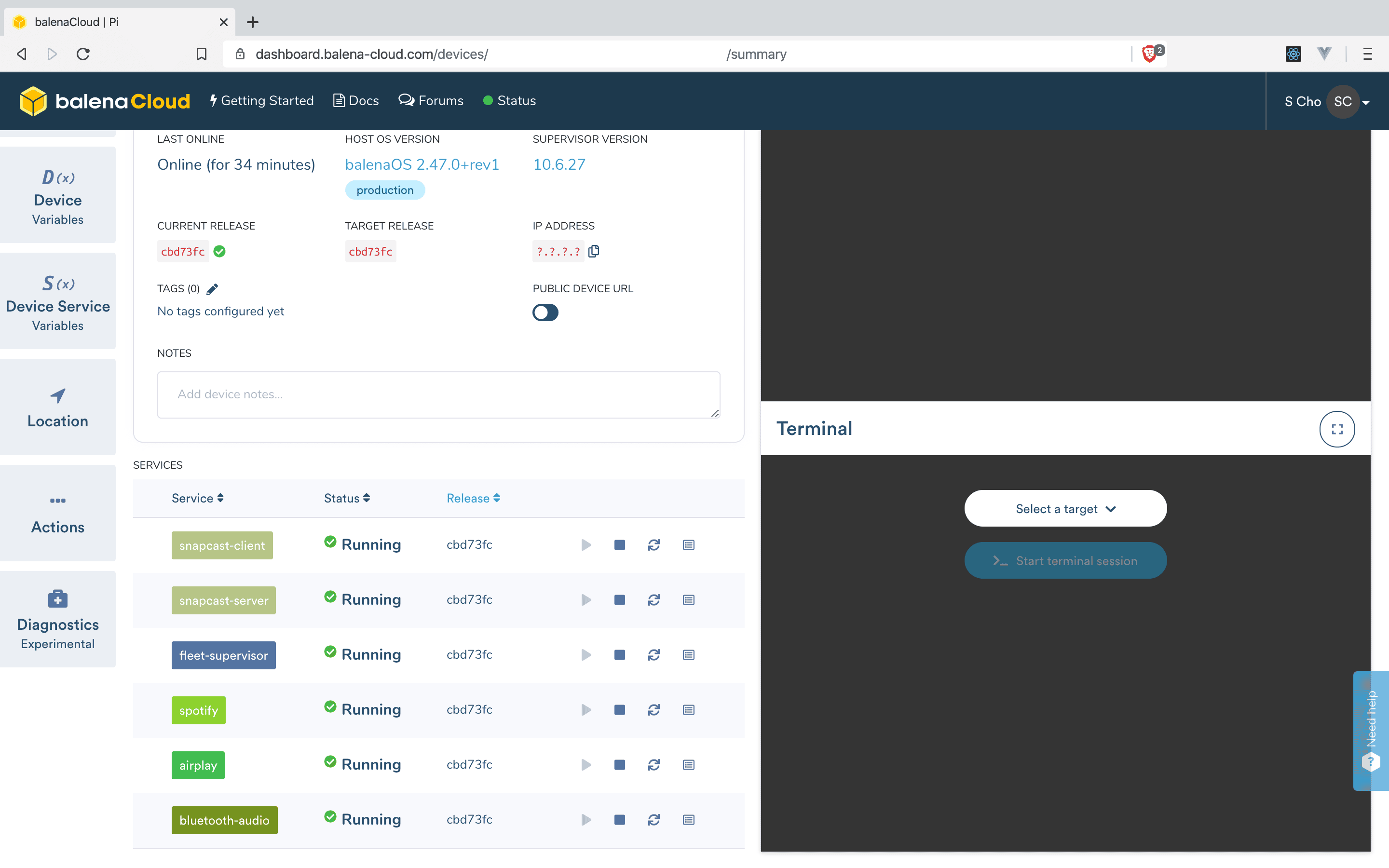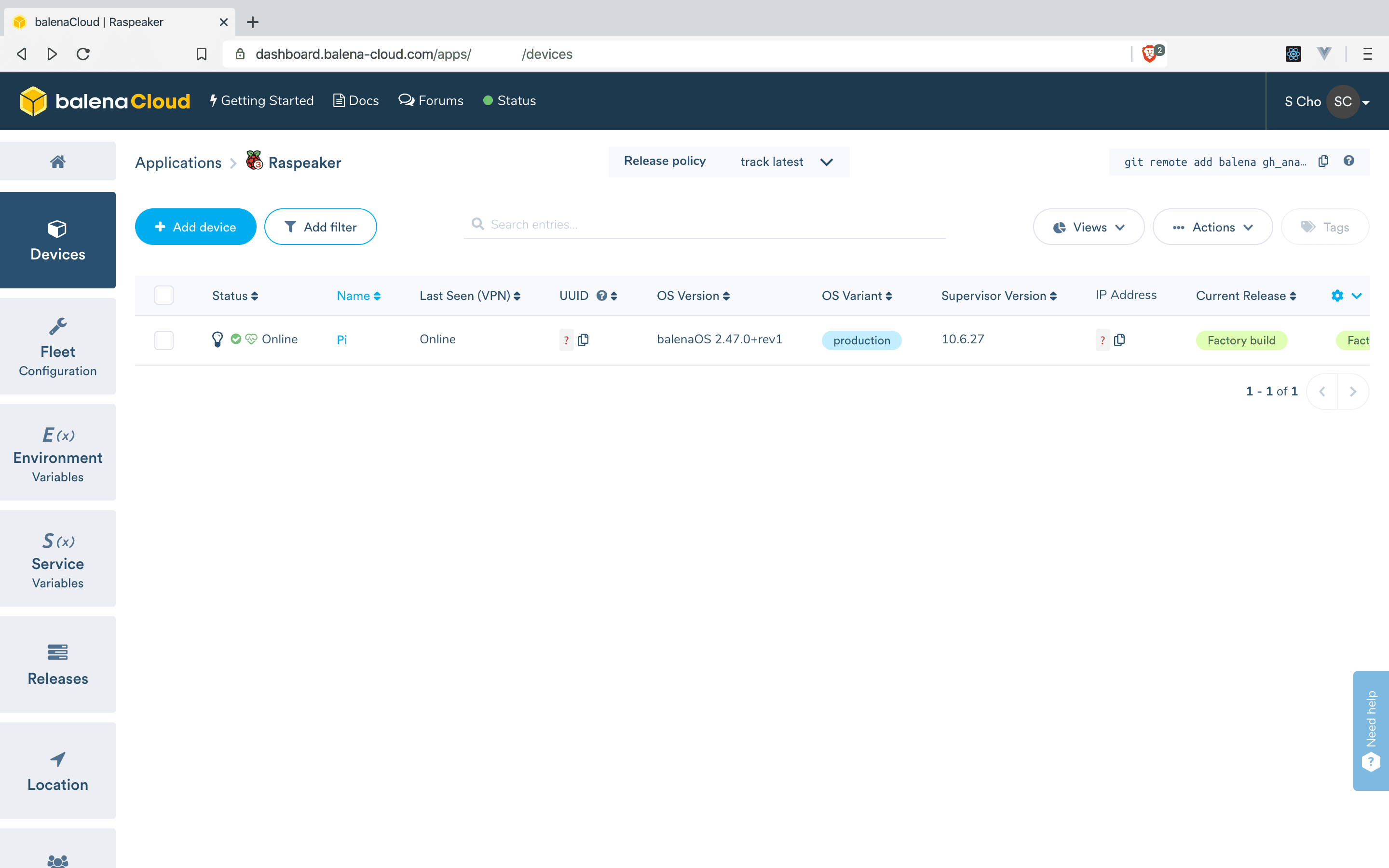 이때 약간의 시간을 주는 것이 좋다. 라즈베리 파이가 프로젝트에 필요한 여러 라이브러리를 설치할 시간이 필요하기 때문이다. 설치 현황은 balenaCloud에서 확인할 수 있다.