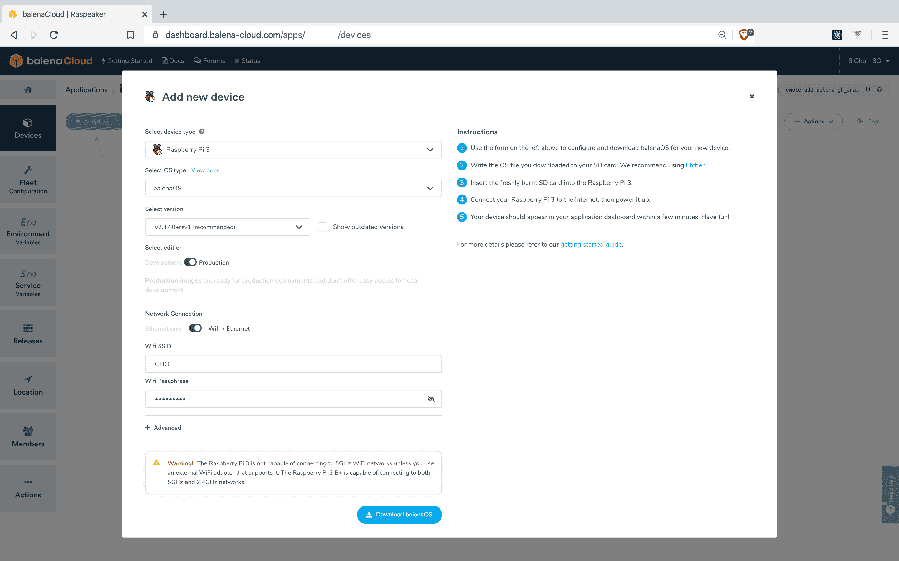 모두 입력했으면 Download balenaOS를 누른 뒤 다운로드를 시작한다. (팁: 미국 VPN 서버를 사용하면 다운로드 속도가 빨라진다.) 다운을 받는 동안 balenaEtcher를 설치하면 시간을 절약할 수 있다. balenaEtcher는 시스템 이미지를 저장 장치에 설치해 주는 도구다.