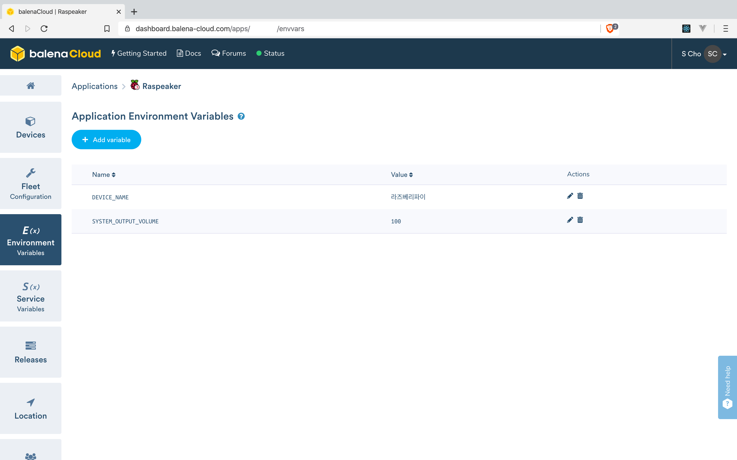 balenaCloud의 기기 설정에서 Environment Variables를 들어가면 여러 값들을 설정해 줄 수 있다.
