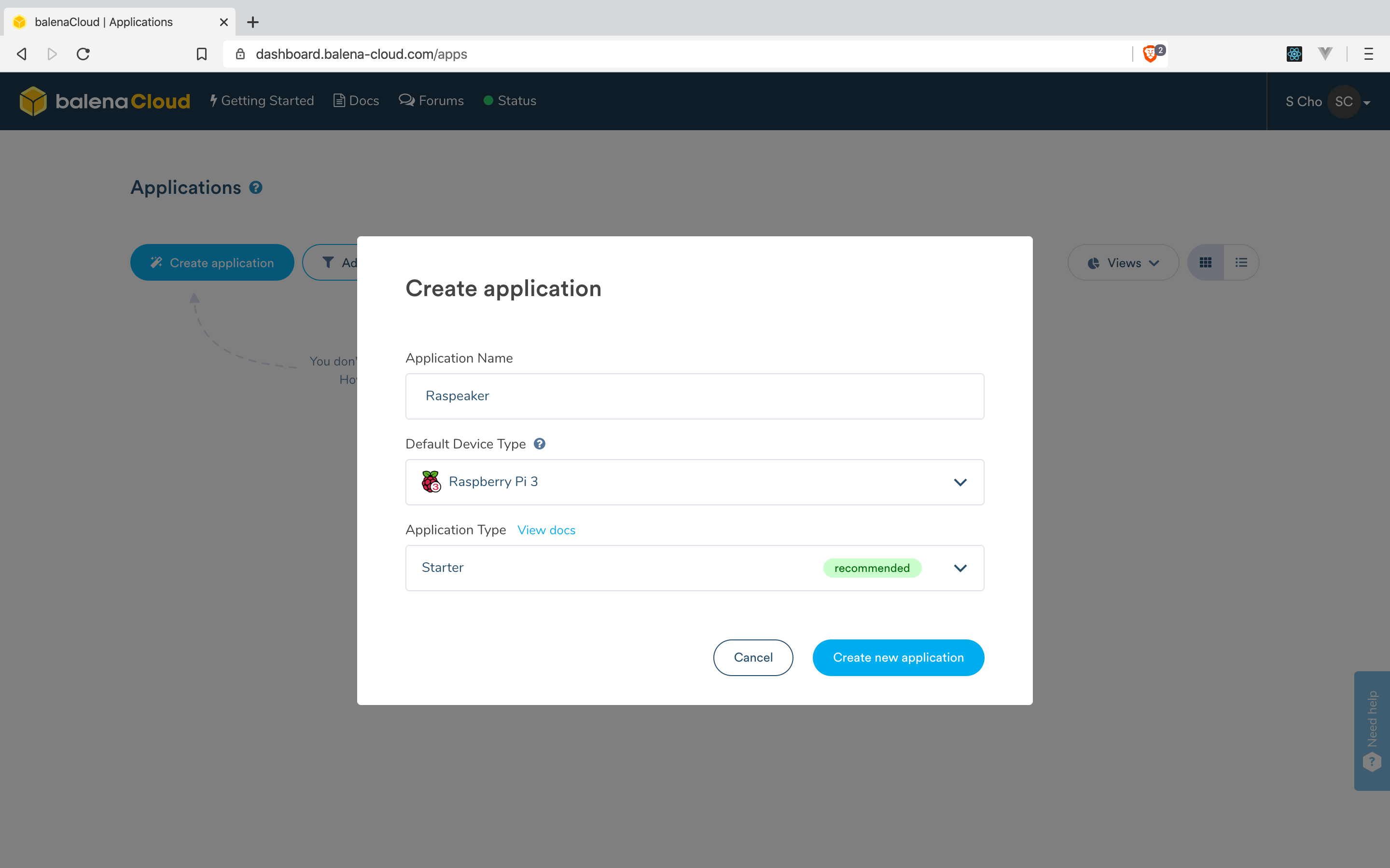 좌측 상단에 있는 Create Application 버튼을 누르면 애플리케이션 이름, 기본 디바이스 종류, 그리고 애플리케이션 종류를 선택할 수 있다. 애플리케이션 이름과 애플리케이션 종류는 자유롭게 선택하면 되고, 기본 디바이스 종류는 자신이 가지고 있는 라즈베리 파이의 종류를 확인하여 알맞은 값을 선택하면 된다. 여기서 입력한 앱 이름은 나중에 사용되니 꼭 기억하자! 이 글의 경우 앱 이름을 Raspeaker로 등록했다.