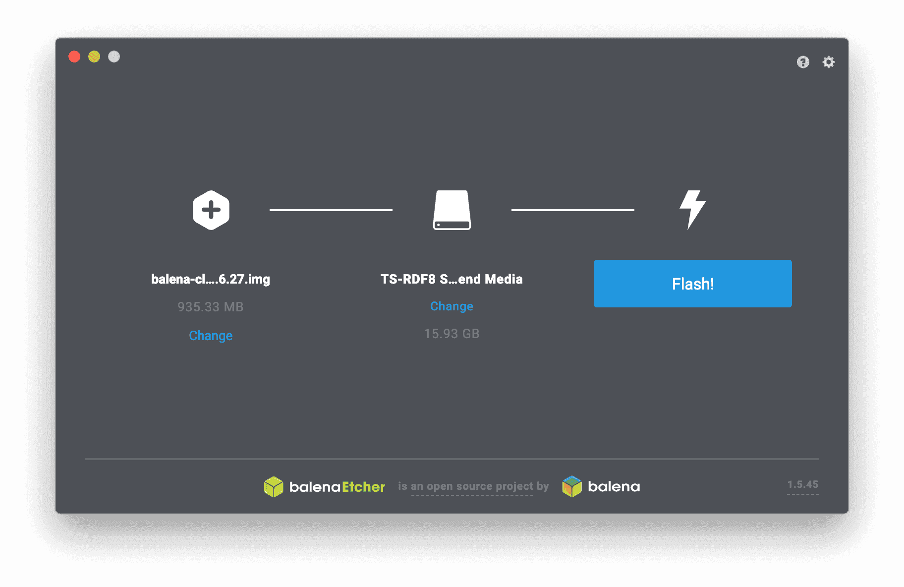 balenaEtcher를 실행해서 다음과 같이 시스템 이미지와 설치할 디스크를 선택한 뒤 Flash! 버튼을 눌러주면 OS 설치가 완료된다.