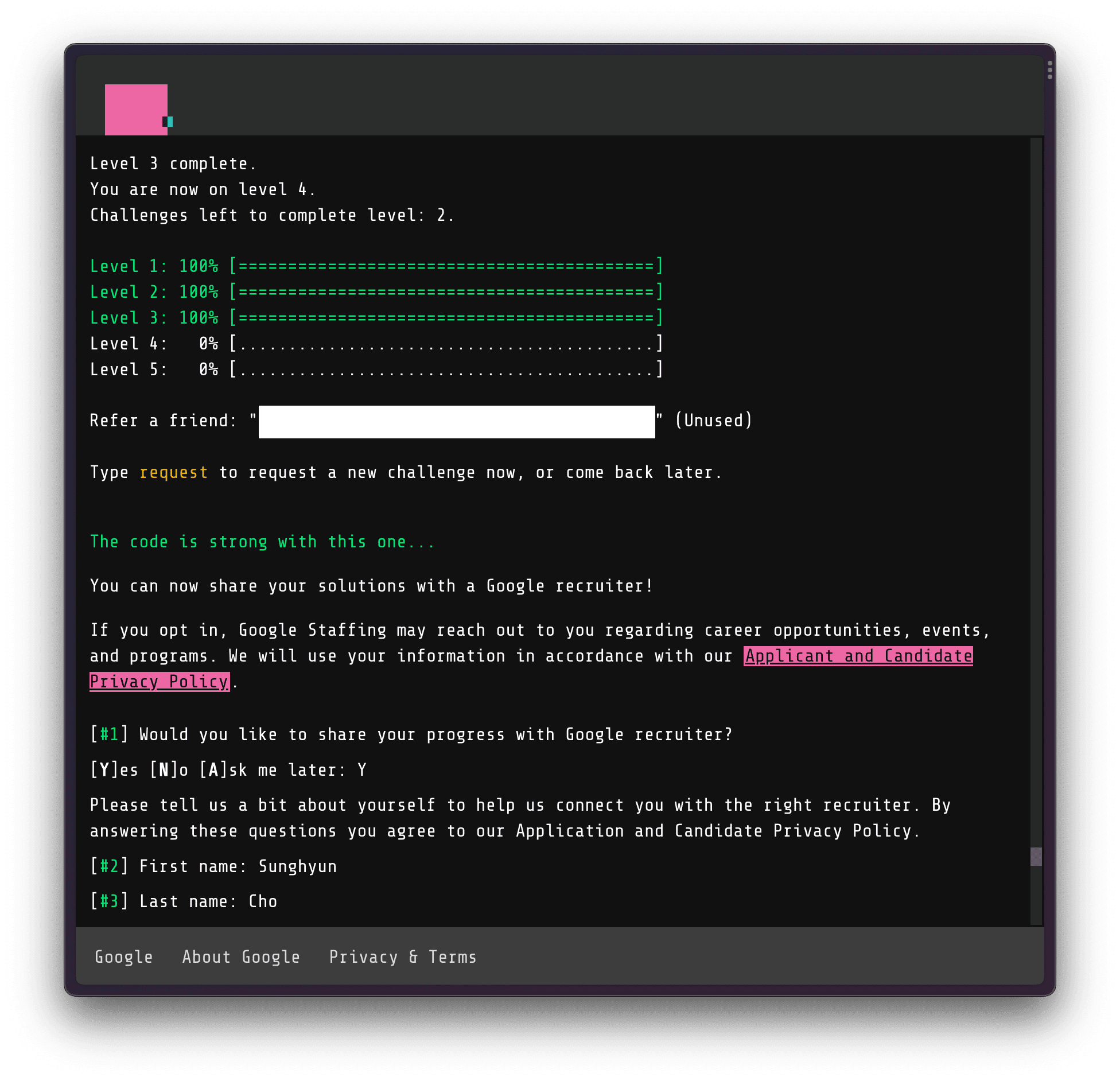 Google Foobar을 해봤다. 구글 리크루터 스테이지까지 가서 좋아했는데 찾아보니까 이제 더이상 채용은 여기로 안 한다는 것 같더라.