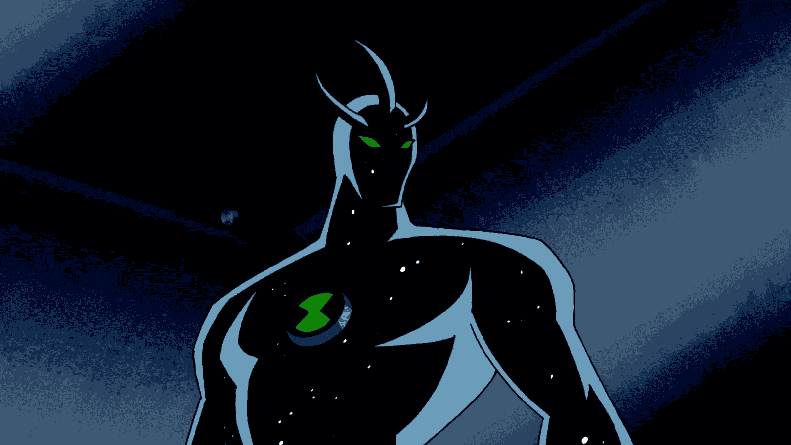 Alien X is a Celestialsapien, a species known for their god-like powers. The character is shown as a humanoid silhouette filled with stars and two starry energy streams coming off its body, representing the character's cosmic nature.