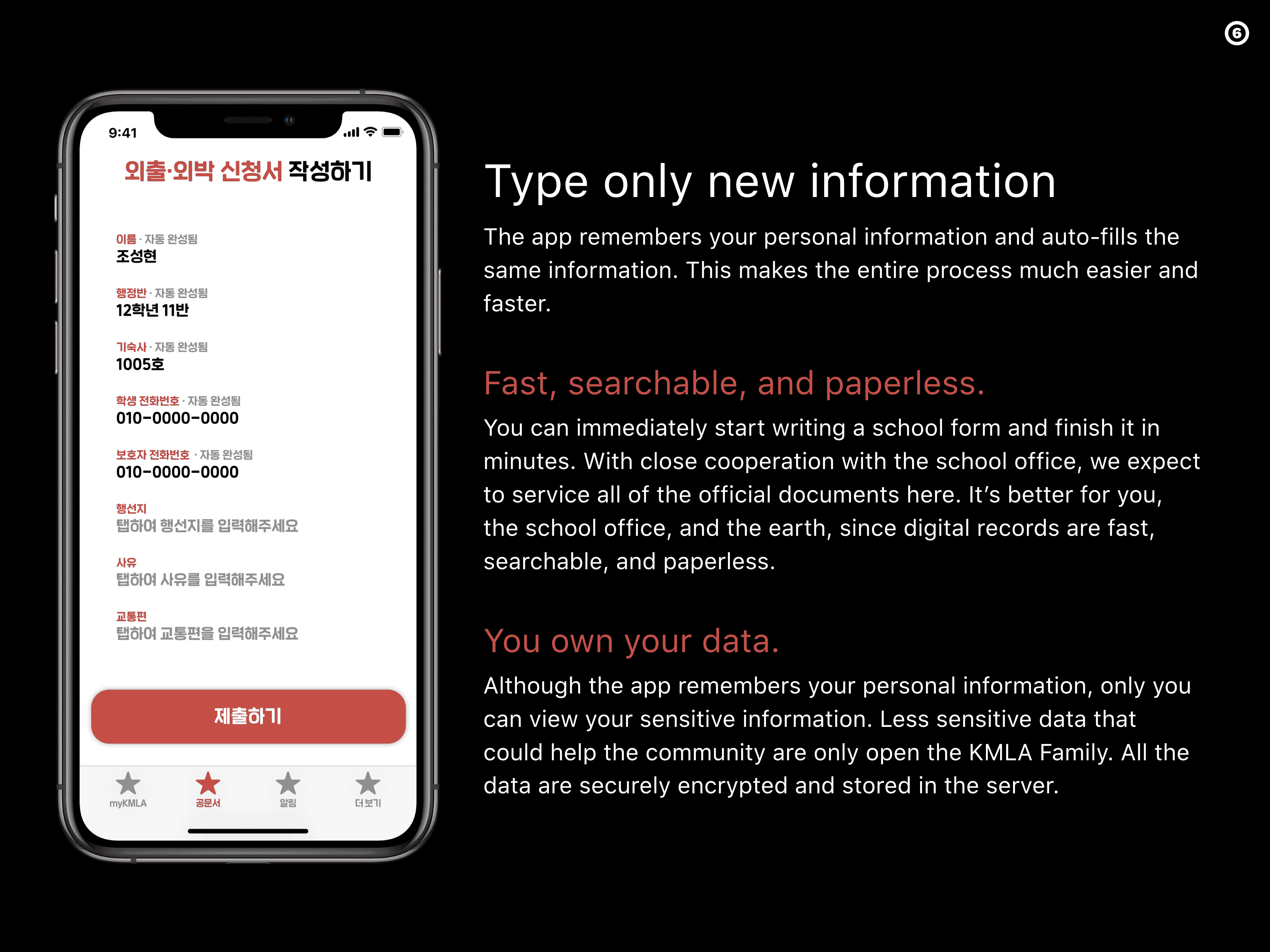 Although the app remembers your personal information, only you can view your sensitive information. Less sensitive data that could help the community are only open to the KMLA Family. All the data are securely encrypted and stored on the server.