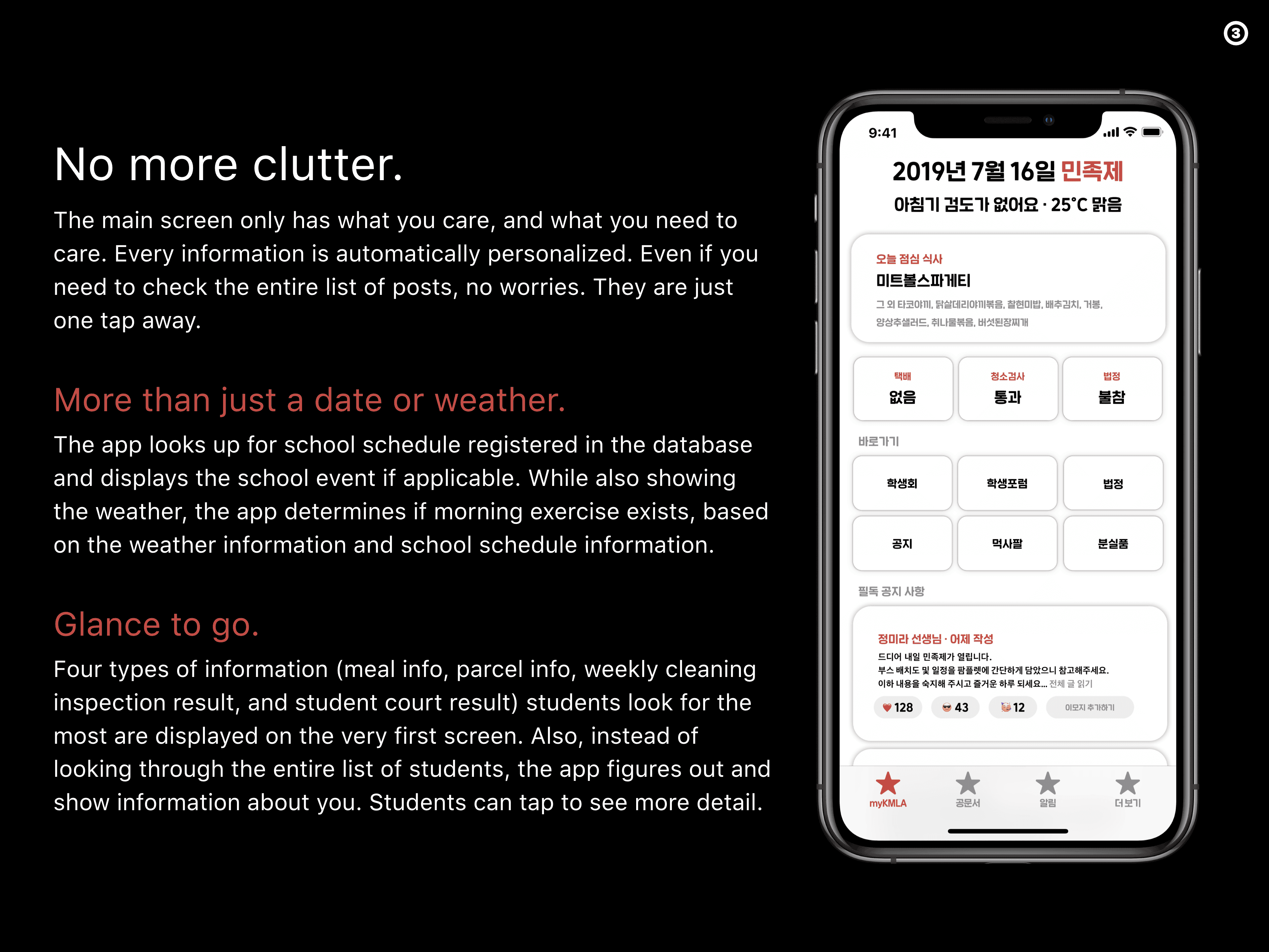 Four types of information (meal info, parcel info, weekly cleaning inspection result, and student court result) students look for the most are displayed on the first screen. Also, instead of looking through the entire list of students, the app figures out and shows information about you. Students can tap to see more details.