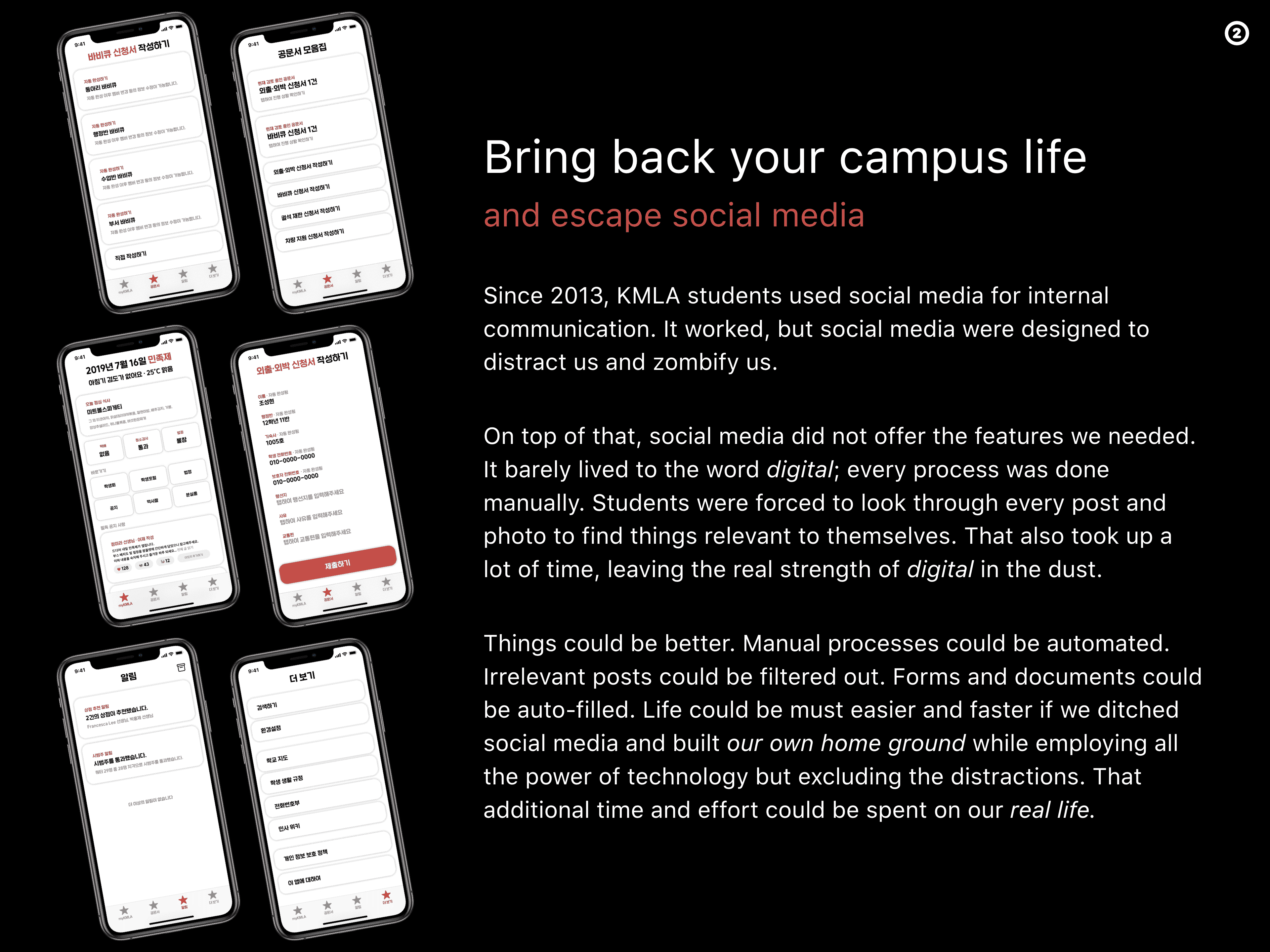 Since 2013, KMLA students used social media for internal communication. It worked, but social media were designed to distract and zombify us.