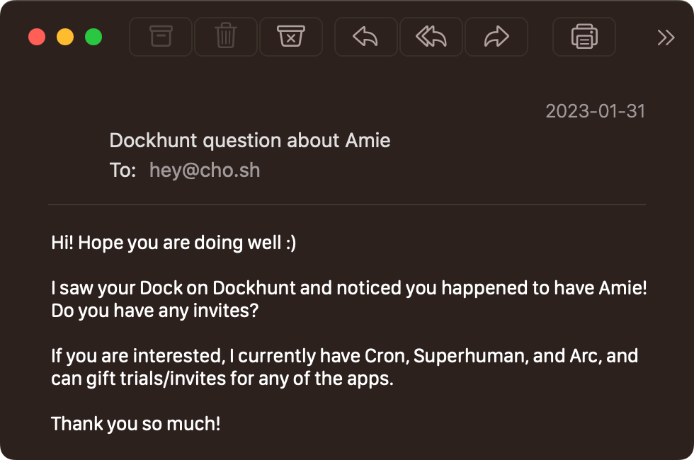A few days ago, I found people were sharing a website listing the apps they pinned to their dock -- dockhunt.com. So I also added my dock to the website, thinking it is an excellent concept. But not so later, I got an interesting inquiry.