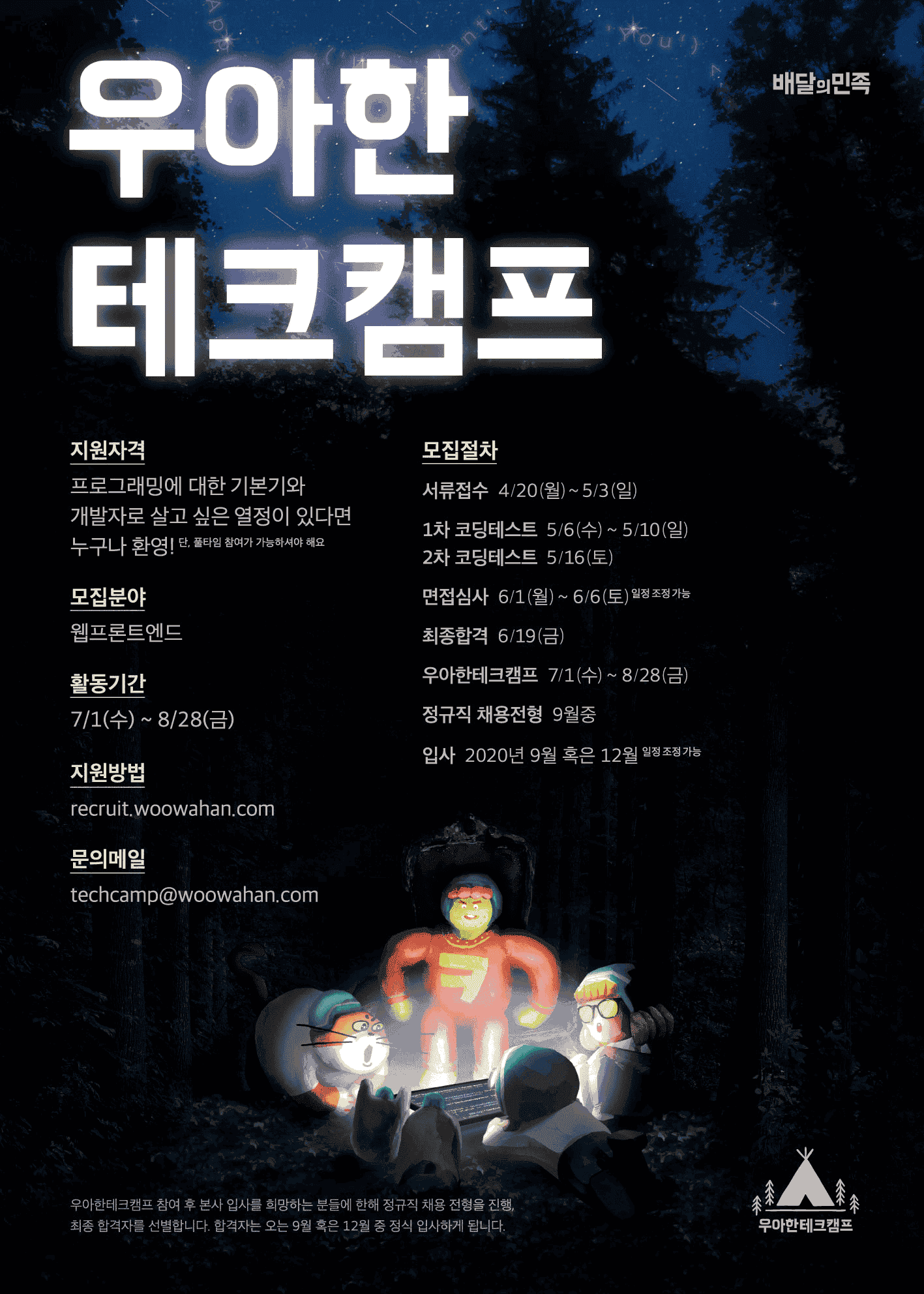 우아한테크캠프는 배달의민족을 운영하는 테크 유니콘 기업 우아한형제들에서 여름 동안 인턴으로 근무하며 실무와 가까운 개발 및 프로그래밍 공부를 하는 프로그래머 양성 과정이다. 선발 인원은 30명이며 경쟁률은 대략 43대 1이다.