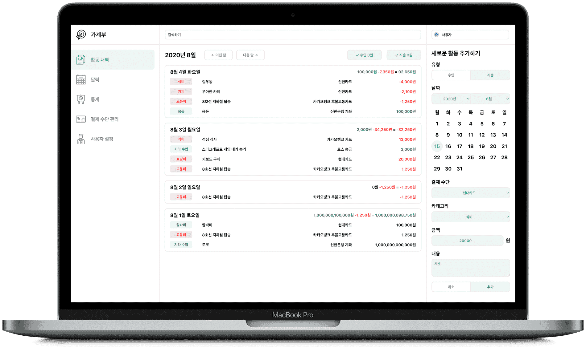 내가 느끼기에 내 디자인의 장점은 ① 화면 요소를 3열로 나누어 배치해서 와이드 스크린의 장점을 적극 활용한다는 점과 ② 우측의 활동 내역 창이 독립적으로 동작하기 때문에 자유롭게 달력, 통계, 결제 수단 관리로 이동해도 우측창의 내용이 유지된다는 점이다. 슬랙이랑 비슷한 느낌?