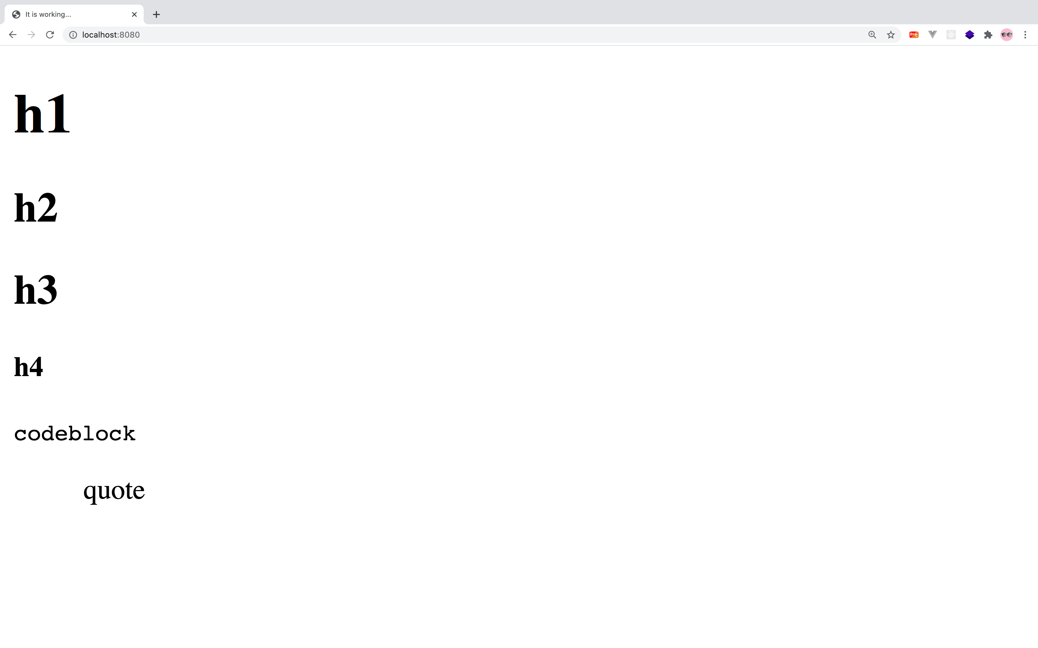 <body> <h1 id="toc_0">h1</h1> <h2 id="toc_1">h2</h2> <h2 id="toc_2">h3</h2> <h4 id="toc_3">h4</h4> <div> <pre class="line-numbers"><code class="language-none">codeblock</code></pre> </div> <blockquote> <p>quote</p> </blockquote> </body></html>결과
