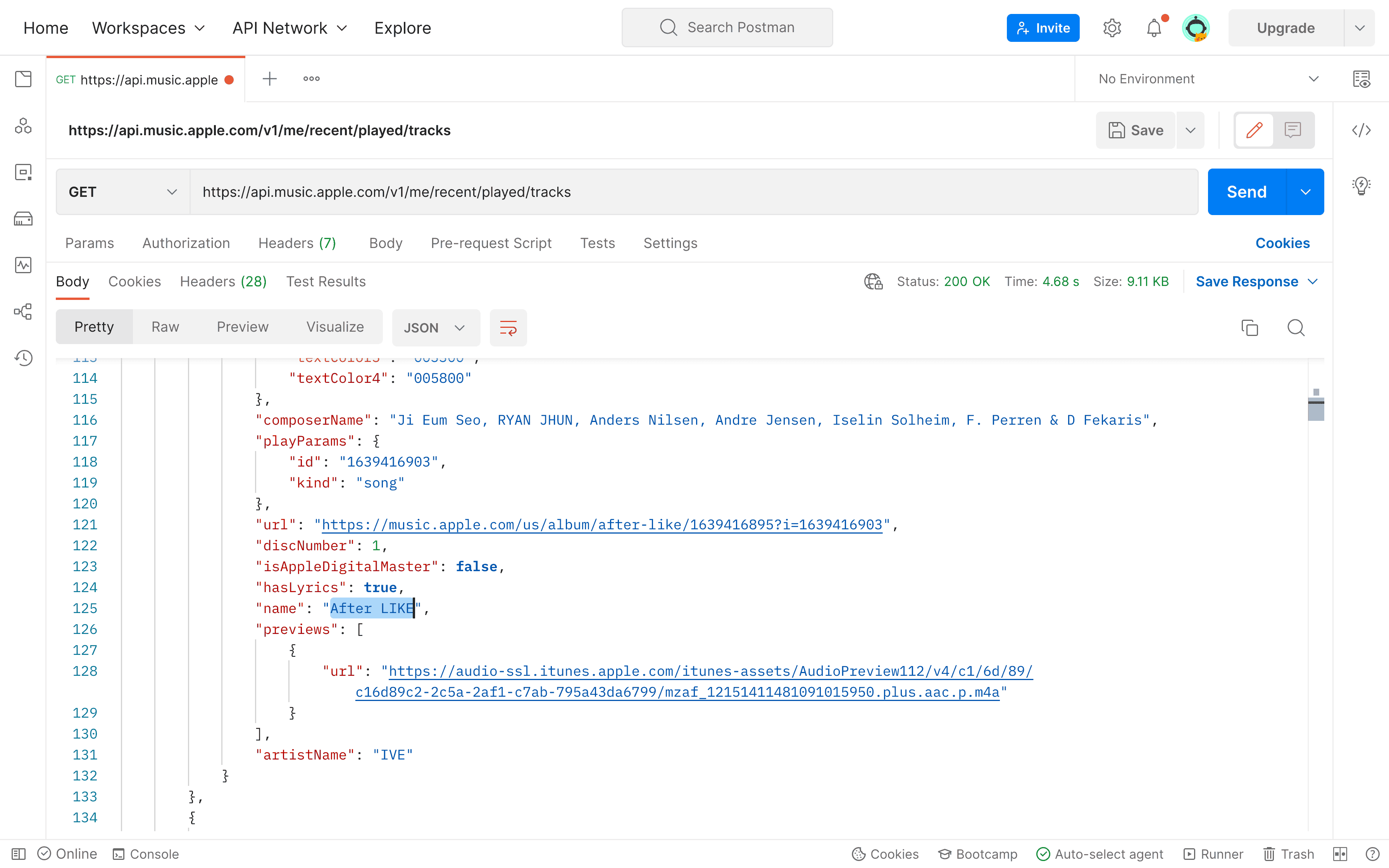 All four pieces of information should work harmoniously to retrieve users' data (of what they were listening to). All the others were pretty straightforward (More Info: Research Note.) The trickiest one was User Token. User Token was specialized for iOS, macOS, and MusicKit on the Web. MusicKit on the Web was intended for Apple Music Web clients, like music.apple.com, Cider, and LitoMusic and was not designed for such API request bots. Still, Apple put MusicKit on the Web will automatically take care of it without documenting it. So what are we going to do? Reverse engineer the API.