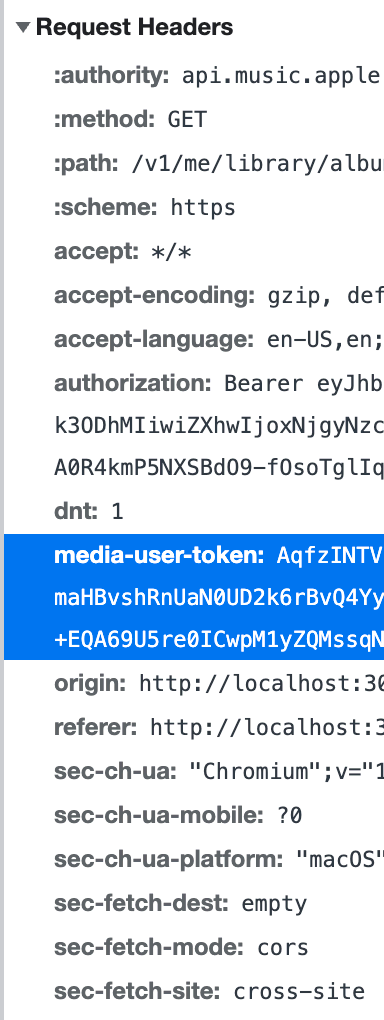 Then digging into the request headers of the website will reveal the media-user-token.