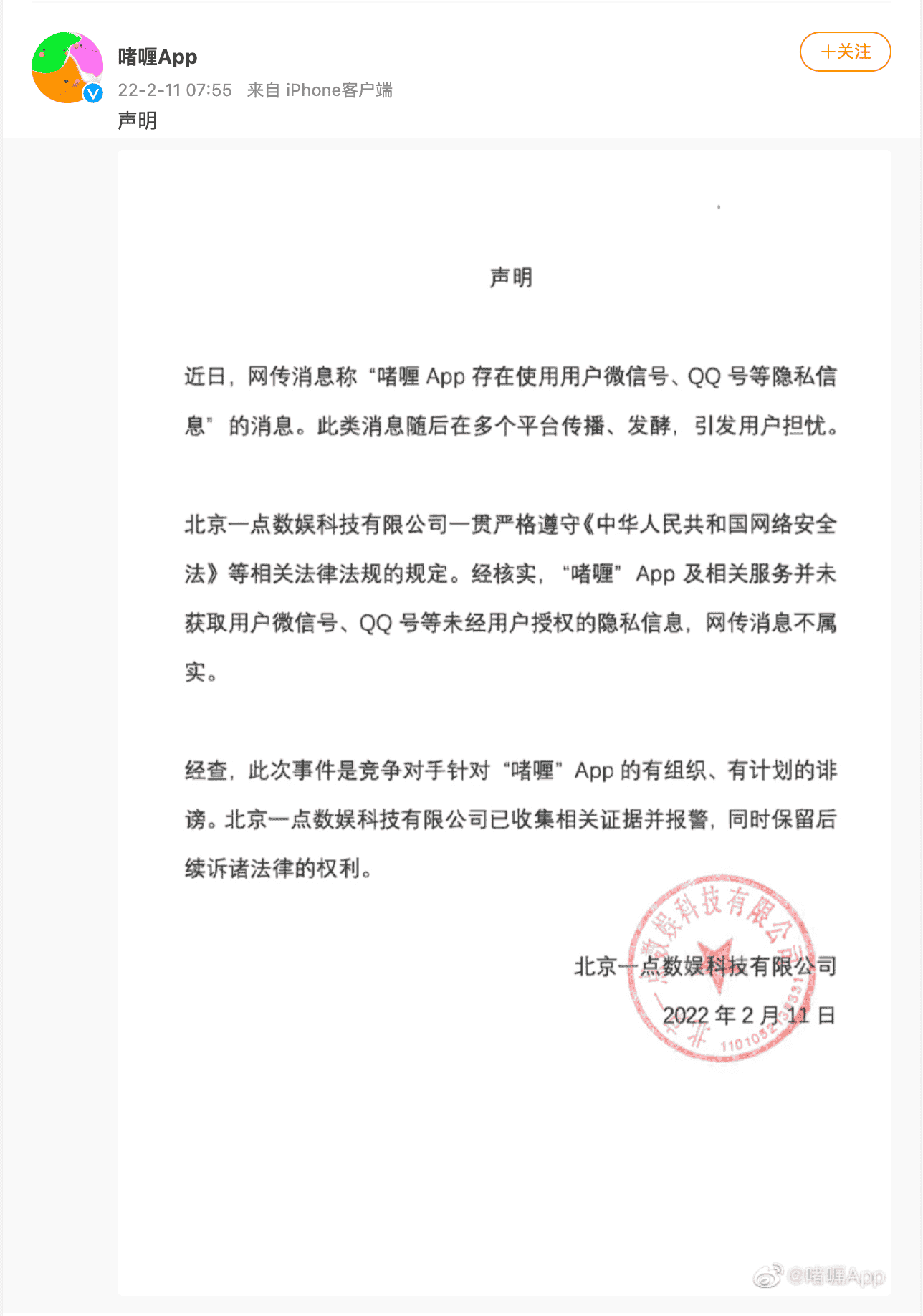 Zheli의 소유 회사인 베이징 이디안슈오 엔터테인먼트 테크놀로지는 곧 2022년 2월 11일에 일체의 의혹을 부인하는 성명을 발표했다.