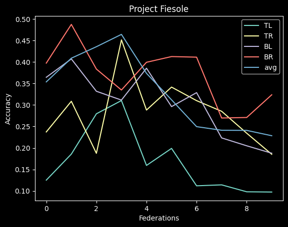 - The averaged model maxes its accuracy around 10-15 federations. Before each federation, each learner trains ten epochs from their corresponding dataset.