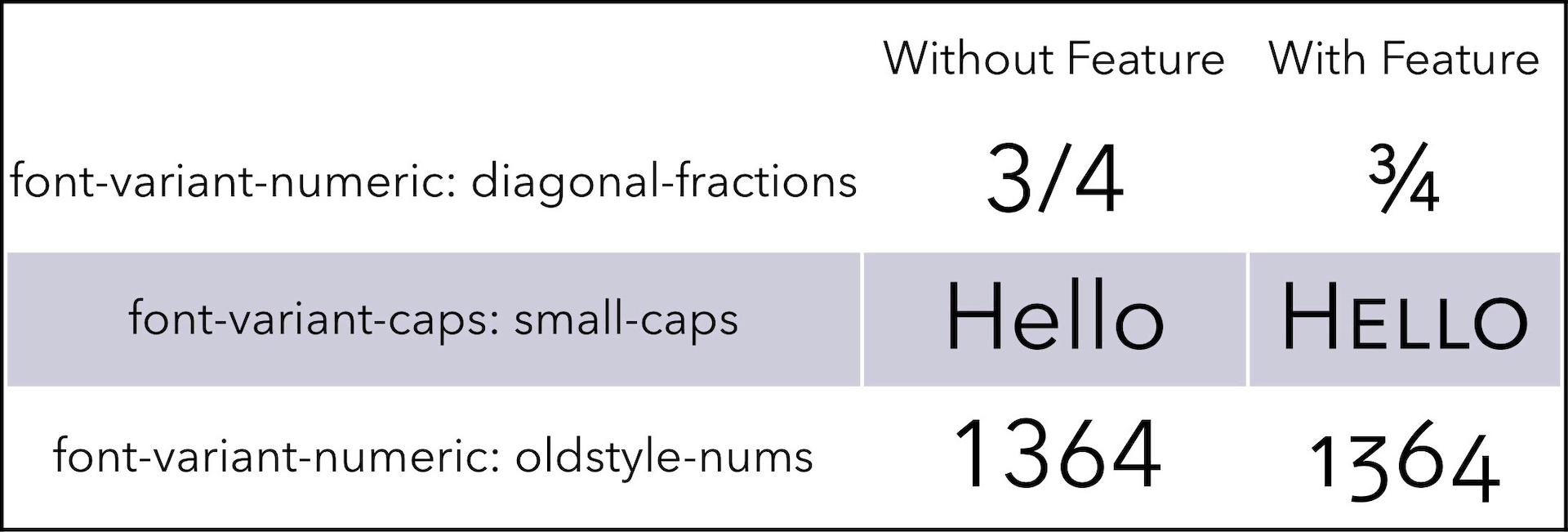Font features are a way to enable advanced text styles and effects as designed by the font author. A font may support several features: some examples include different kinds of ligatures, tabular numbers, or small caps. Because the designer explicitly created forms for these variants in the font file, using font features is the highest quality way of achieving these effects. CSS Font Features