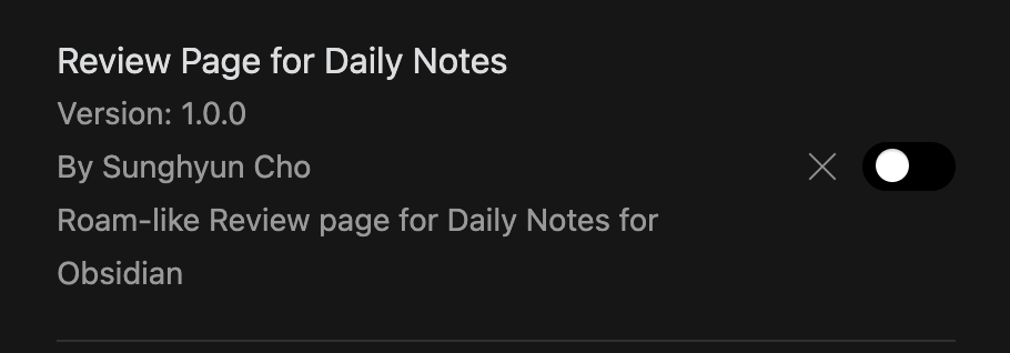 { "id": "review-page-for-daily-notes", "name": "Review Page for Daily Notes", "version": "1.0.0", "minAppVersion": "0.12.0", "description": "Roam-like Review page for Daily Notes for Obsidian", "author": "Sunghyun Cho", "authorUrl": "https://cho.sh", "isDesktopOnly": false, "js": "main.js"}이렇게 하면 다음과 같이 옵시디언이 플러그인을 인식한다.