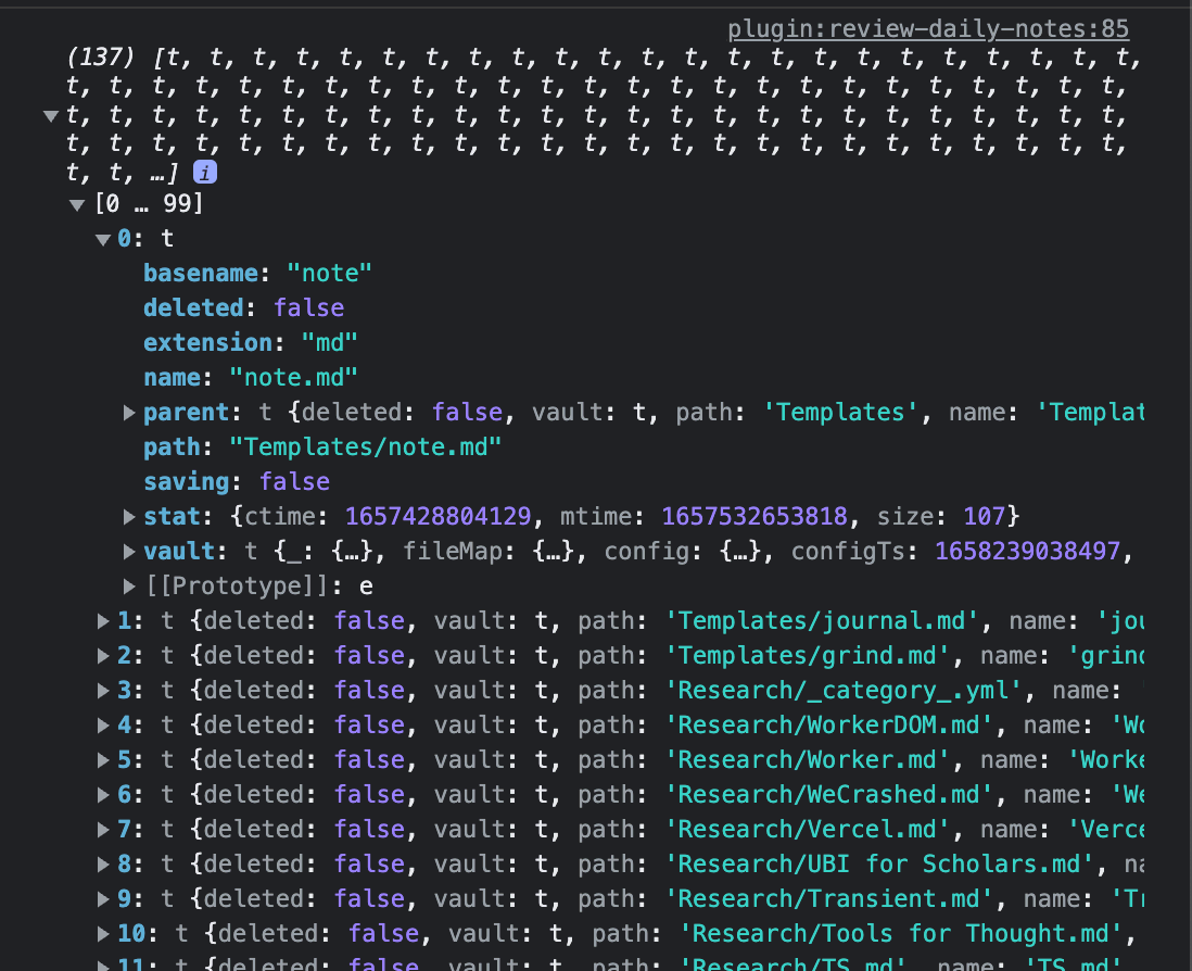 public loadDailyNotes(): TFile[] { const { dailyNotesFolder } = this.settings; const files = this.app.vault.getFiles(); const dailyNotes = files.filter( (file) => file.path.startsWith(dailyNotesFolder) && file.path.endsWith(".md") ); console.log(dailyNotes); return dailyNotes;}더 나아가 Daily Notes를 정렬할 수 있다.