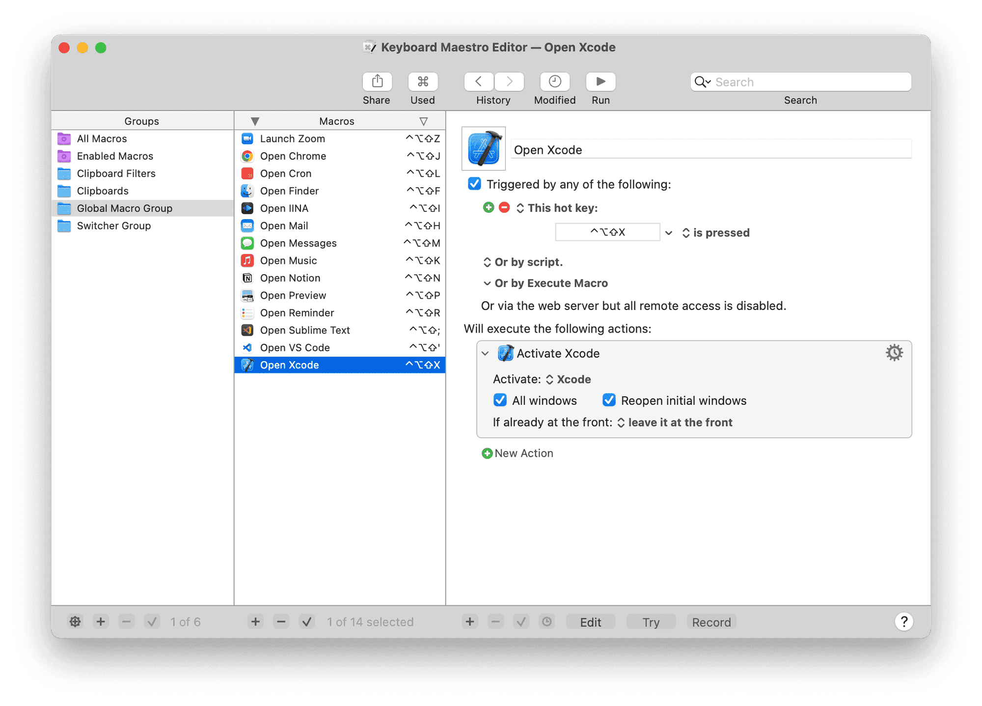// `language.json`{ "title": "Multilingual Input Methods", "rules": [ { "description": "R Command to Gureum Han2", "manipulators": [ { "type": "basic", "from": { "key_code": "right_command", "modifiers": { "optional": ["any"] } }, "to": [ { "key_code": "right_command", "lazy": true } ], "to_if_alone": [ { "select_input_source": { "input_source_id": "org.youknowone.inputmethod.Gureum.han2" } } ] } ] }, { "description": "L Command to Gureum Roman", "manipulators": [ { "type": "basic", "from": { "key_code": "left_command", "modifiers": { "optional": ["any"] } }, "to": [ { "key_code": "left_command", "lazy": true } ], "to_if_alone": [ { "select_input_source": { "input_source_id": "org.youknowone.inputmethod.Gureum.system" } } ] } ] } ]}Then I configured a bunch of shortcuts to fly through my Mac. Remember ⌃⌥⇧ is the so-called Hyper Key that I made, which uses the Caps Lock key or 한/영 키 (Korean-English Key). That is, because, I never use the Caps Lock key (I use shift) and I click the right command key to type Korean and click the left command key to type English, inspired by the Japanese Apple keyboard's Kana (かな) and English Key (英数) Link.