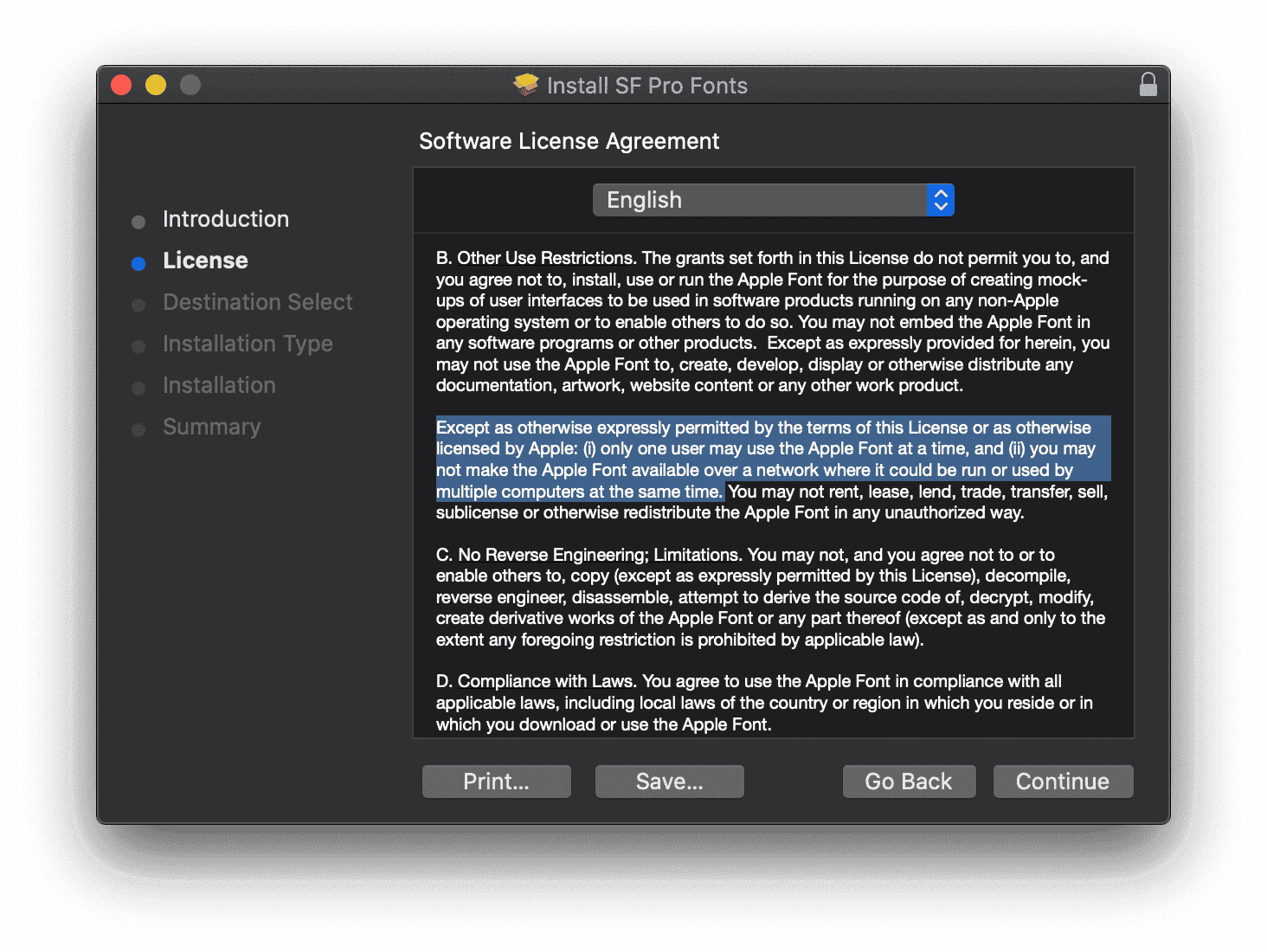 Except as otherwise expressly permitted [...] you may not make the Apple Font available over a network where it could be run or used by multiple computers at the same time. (명시적으로 허용되지 않은 이상, Apple의 폰트를 네트워크 상에서 제공하여 여러 컴퓨터에서 동시에 사용할 수 없습니다.)