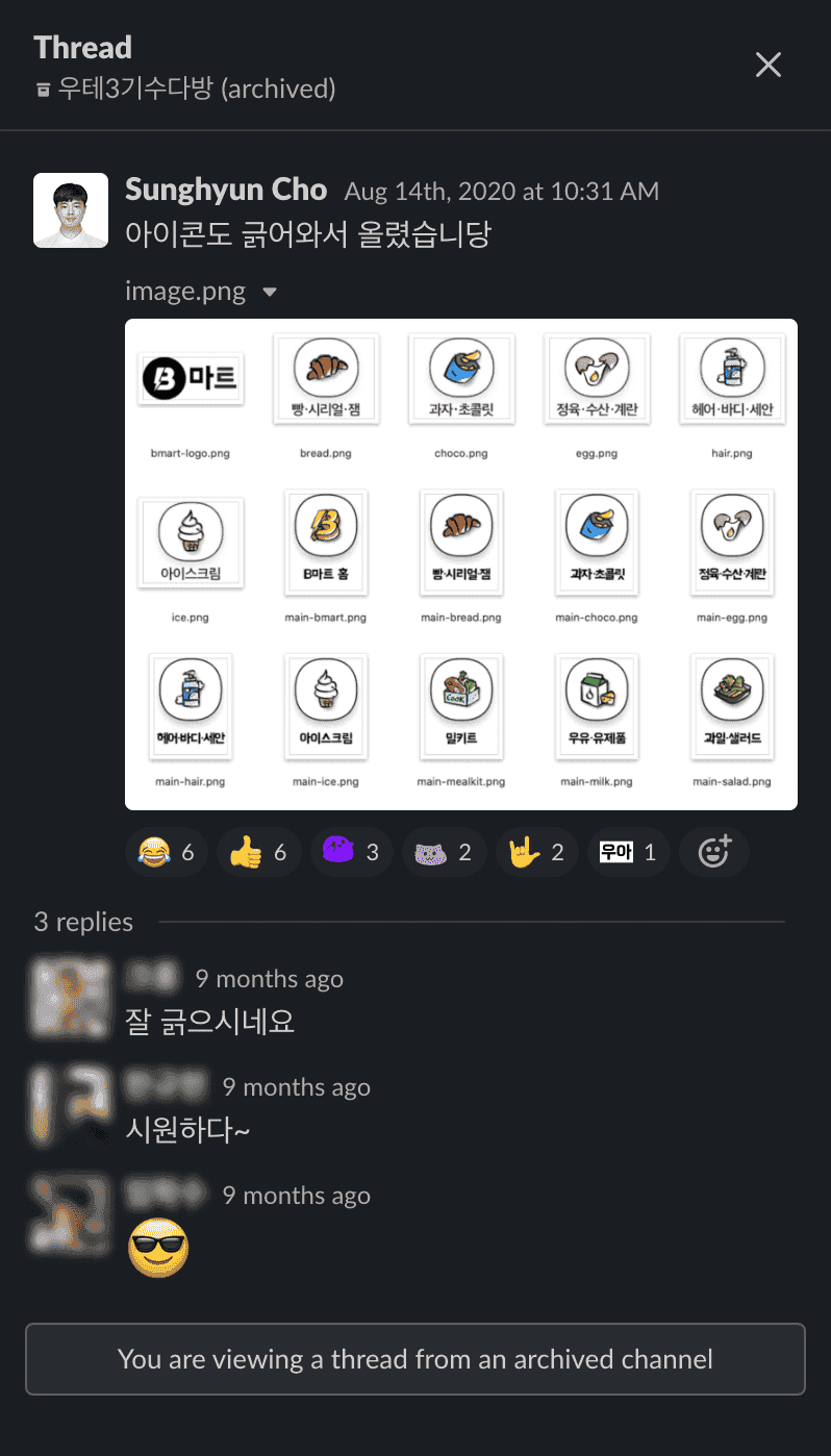 단순하게 B마트 웹뷰를 띄워서 CSS 셀렉터를 쓰는 얕은 수준의 크롤링도 아니었고 우테캠이라고 리소스 서버 내부 자료를 공유 받은 것도 아니어서 꽤나 노력이 들어갔다. 간단하게만 공유하자면 iOS 배민 앱 통신을 감청해서 엔드 포인트와 이미지 주소를 알아냈고 약간의 CTF를 통해서 이미지 주소 리스트를 알아낼 수 있었다. 해당 이미지 서버에 있는 이미지와 아이콘, 효과음 등을 1,000건 정도 긁어서 다른 우테캠 캠프생 분들이 쓸 수 있도록 프라이빗 저장소에 공유했다.