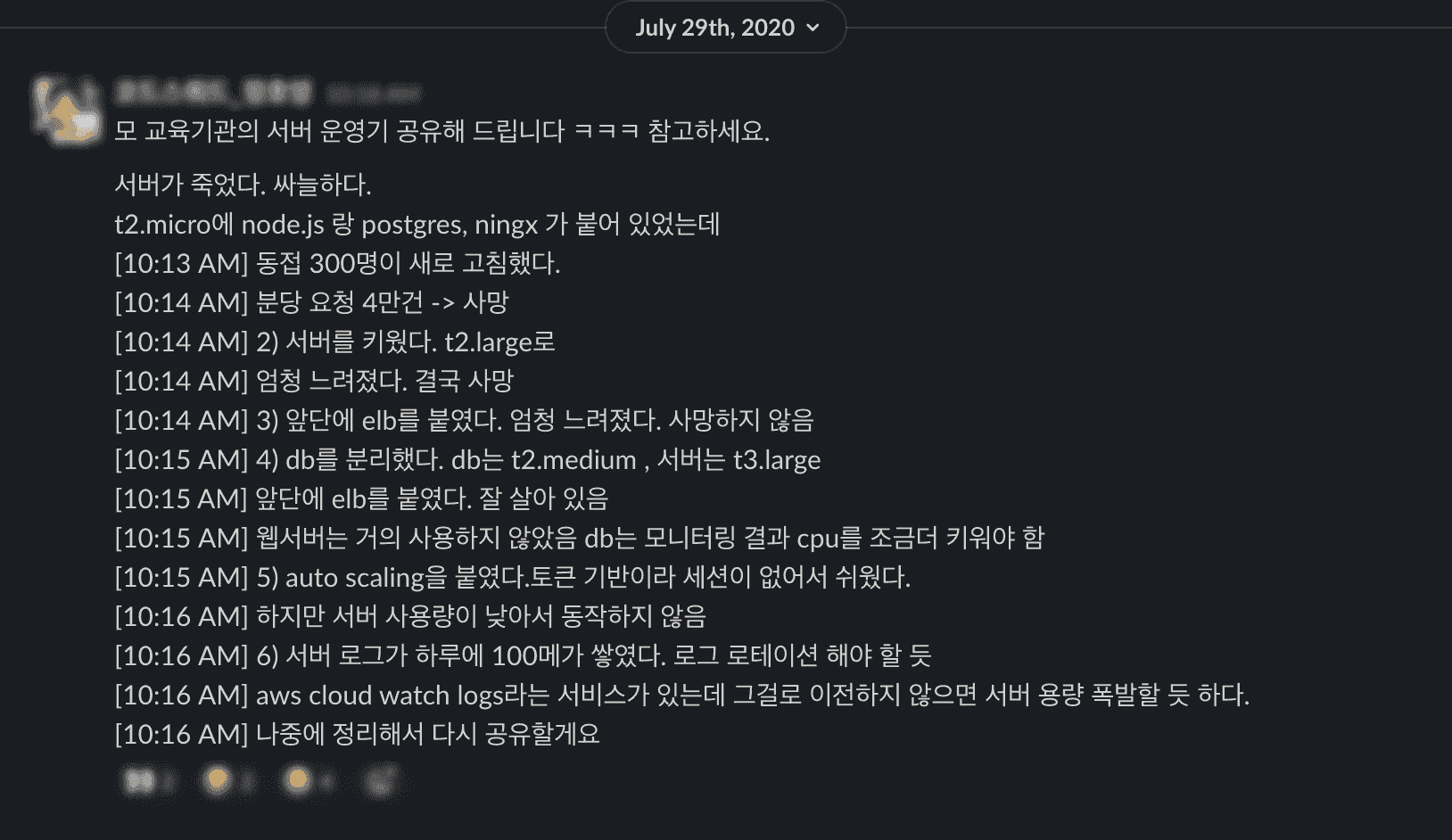 우리나라 기업들의 비하인드스토리를 중간중간 들을 수 있었다. 모 게임 기업에서는 아이템이 수십만 개씩 양산되기에 RDB를 잘 쓰지 않고 바이너리 덤프를 사용한다는 이야기, 누군가 게임 DB 필드를 조작해 몇억 원짜리 아이템을 복제한 사건이 발생해 이후부터 DB 접근 권한 관리가 매우 철저해졌다는 이야기, 모 숙박 업체에서 개발자들이 모든 회원들의 개인 정보를 열람할 수 있어서 한동안 개발자들이 마음대로 연예인 회원 정보를 열람했었다는 이야기, 모 검색 업체 의장이 "경쟁 업체보다 1초 빠르게 만들어"라고 지시했었다는 이야기... 기업 생태계에 관심이 많은 나에게는 정말 재미있는 이야기였다.