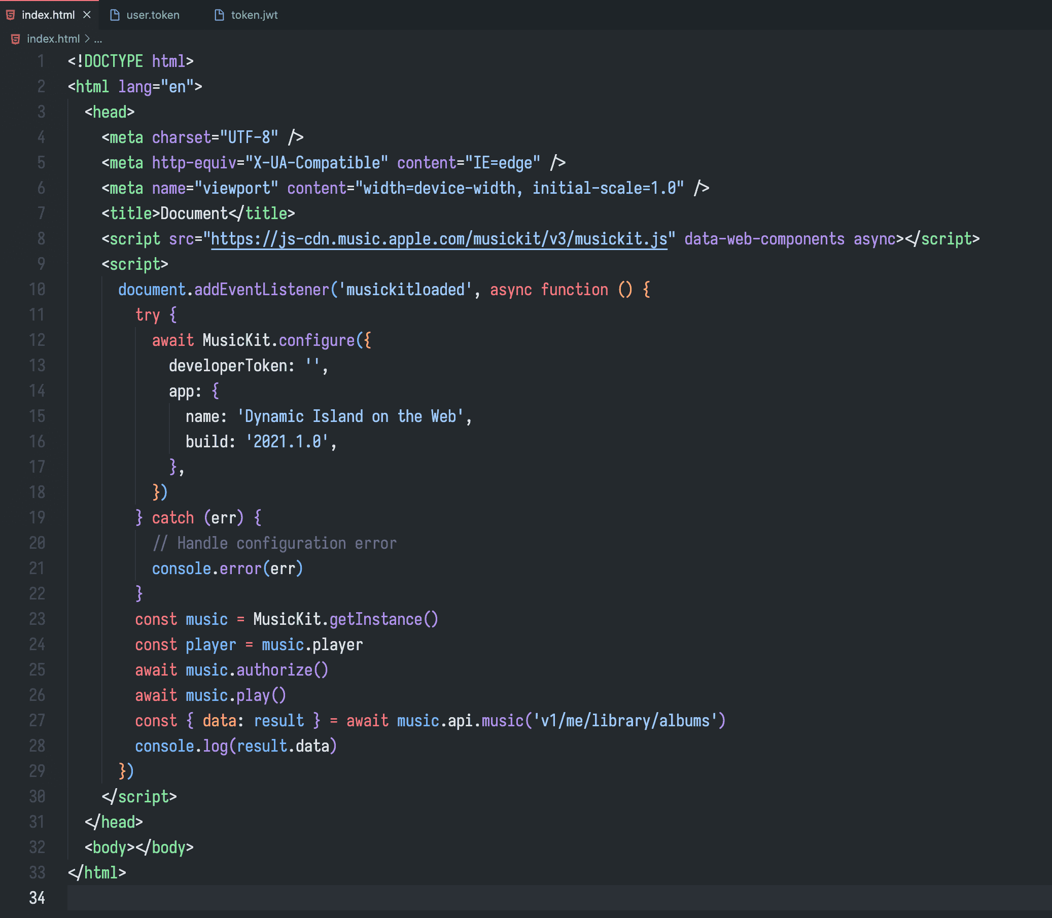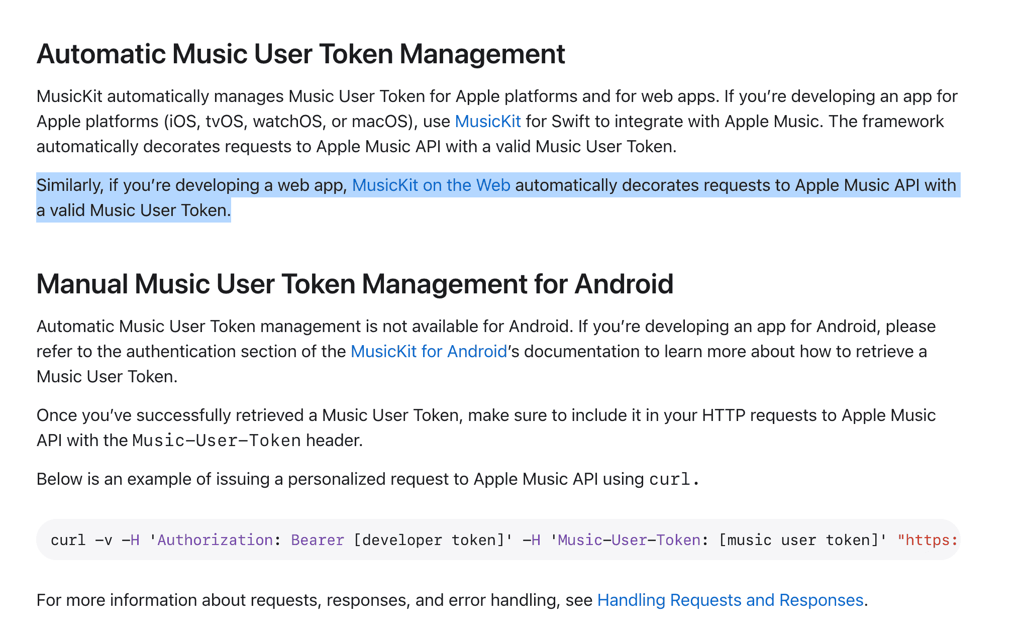 As a part of Dynamic Island on the Web, I reverse-engineered Apple Music API to get the undocumented Personal Token. It doesn't mention how to get that token! Apple Music API DX is way worse than Spotify's.