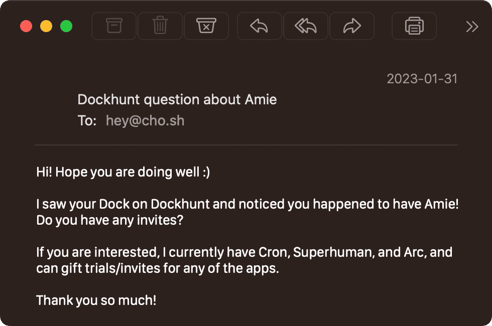 며칠 전 사람들이 자신의 독에 무슨 앱을 박아놓는지 공유하는 dockhunt.com이라는 웹사이트를 알게 되었다. 신기한 콘셉트라고 생각하며 내 독을 공유했다. 근데 얼마 지나지 않아 흥미로운 질문을 받았다.